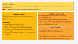Üç veya daha fazla grubun ortalamalarını karşılaştırmak için Tek Yönlü ANOVA’yı kullanırız. Varsayımlar sağlandığında (normal dağılım, varyans homojenliği) güvenilir sonuç verir. Eğer anlamlı bir fark bulunursa, hangi gruplar arasında farklılıklar olduğunu anlamak için post-hoc testler (Tukey, Bonferroni vb.) yapmalıyız. Normal dağılım varsayımı karşılanmadığında Kruskal-Wallis Varyans Analizini kullanmalıyız.