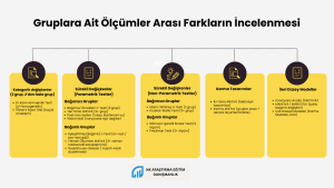 Sürekli Değişkenler (Parametrik Testler): İki grup arasında, ölçümler arasında fark olup olmadığını incelemek için Bağımsız Gruplar t-Testini, aynı grubun ön-test / son-test gibi eşleştirilmiş ölçümleri arasında fark olup olmadığını belirlemek için Bağımlı Gruplar t-Testini kullanırız. Üç ve daha fazla grubun ölçümleri arasındaki farkları karşılaştırmada ise ANOVA veya Tekrarlı Ölçümler ANOVA kullanırız. Varsayımların (normal dağılım, varyans homojenliği) ihlal edilmesi durumunda Welch testi ve Greenhouse-Geisser/Huynh-Feldt düzeltmeleri ya da nonparametrik alternatifleri tercih ederiz.