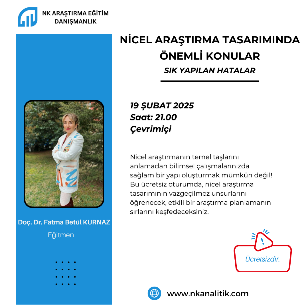Nicel araştırmanın temel taşlarını anlamadan bilimsel çalışmalarınızda sağlam bir yapı oluşturmak mümkün değil! Bu ücretsiz oturumda, nicel araştırma tasarımının vazgeçilmez unsurlarını öğrenecek, etkili bir araştırma planlamanın sırlarını keşfedeceksiniz. Araştırma tasarımında sıkça yapılan hatalardan kaçınmak, verilerinize uygun analiz yöntemlerini doğru seçmek ve akademik ve profesyonel projelerde güvenilir sonuçlar elde etmek için bu etkinliği kaçırmayın.