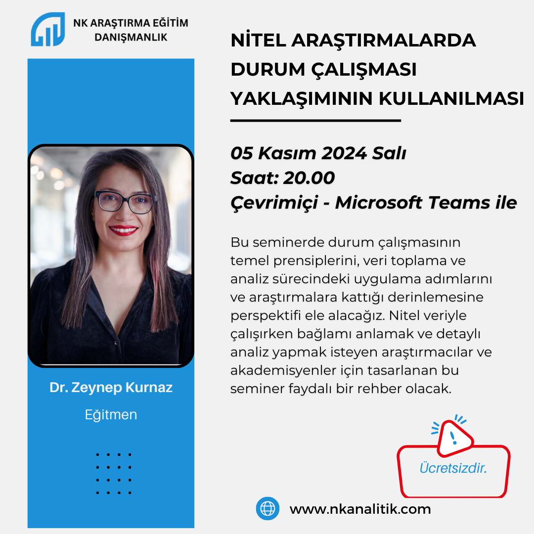 Nitel araştırmalarda derinlemesine analiz yapmanın güçlü yöntemlerinden biri olan Durum Çalışması Yaklaşımı ile tanışmaya davetlisiniz! Bu webinar, sizlere vaka çalışmasının nitel araştırmalarda nasıl etkin bir şekilde kullanılabileceğini göstererek, araştırma sürecinize yeni bir boyut kazandırmayı hedefliyor.