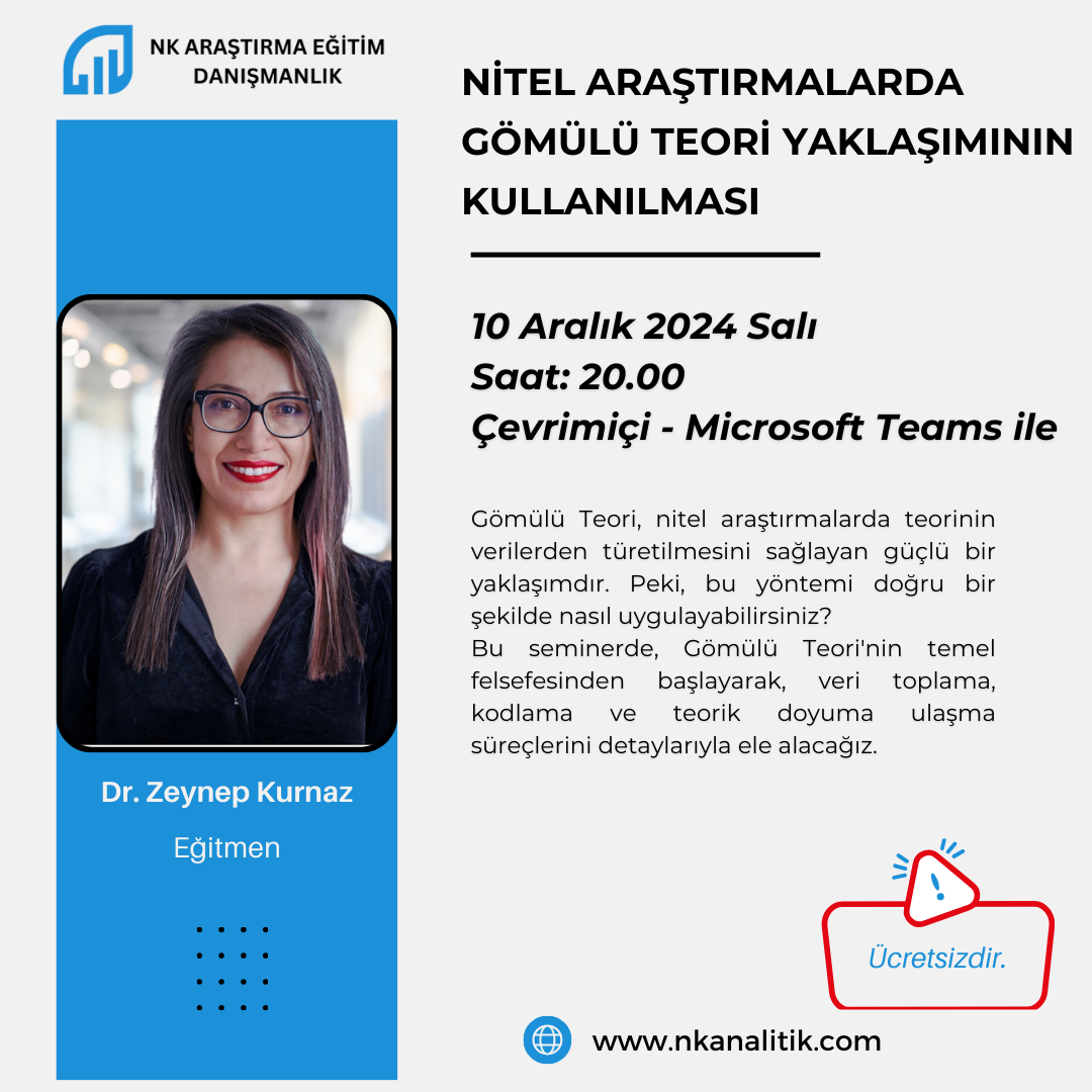 Bu seminerde, Gömülü Teori’nin temel felsefesinden başlayarak, veri toplama, kodlama ve teorik doyuma ulaşma süreçlerini detaylarıyla ele alacağız. Ayrıca, bu yöntemi kullanarak bilimsel çalışmalarda özgün ve güçlü teoriler geliştirme stratejilerini paylaşacağız.