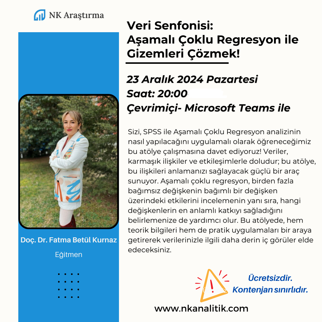 Sizi, SPSS ile Aşamalı Çoklu Regresyon analizinin nasıl yapılacağını uygulamalı olarak öğreneceğimiz bu atölye çalışmasına davet ediyoruz! Veriler, karmaşık ilişkiler ve etkileşimlerle doludur; bu atölye, bu ilişkileri anlamanızı sağlayacak güçlü bir araç sunuyor. Aşamalı çoklu regresyon, birden fazla bağımsız değişkenin bağımlı bir değişken üzerindeki etkilerini incelemenin yanı sıra, hangi değişkenlerin en anlamlı katkıyı sağladığını belirlemenize de yardımcı olur. Bu atölyede, hem teorik bilgileri hem de pratik uygulamaları bir araya getirerek verilerinizle ilgili daha derin içgörüler elde edeceksiniz. Katılımcılar, gerçek veriler üzerinde çalışarak analiz yapma ve sonuçları yorumlama becerilerini geliştirecekler. Hazır mısınız? Gelin, verilerin dünyasında birlikte derinlemesine bir yolculuğa çıkalım!