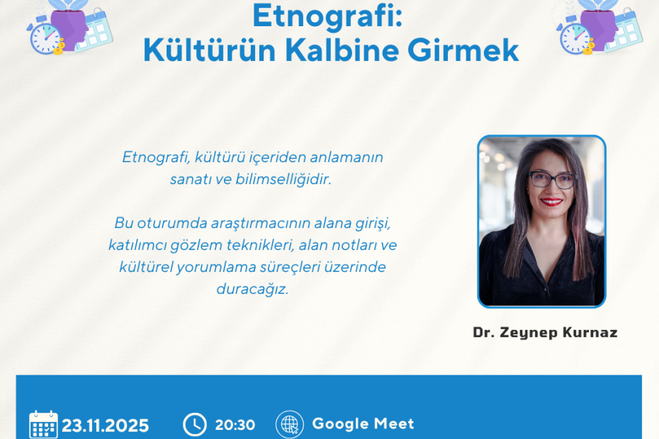 Etnografi, kültürü içeriden anlamanın sanatı ve bilimselliğidir. Bu oturumda araştırmacının alana girişi, katılımcı gözlem teknikleri, alan notları ve kültürel yorumlama süreçleri üzerinde duracağız. Katılımcılar, bir topluluğun gündelik yaşamına duyarlılıkla yaklaşmayı,… Daha fazlasını oku »Etnografi: Kültürün Kalbine Girmek