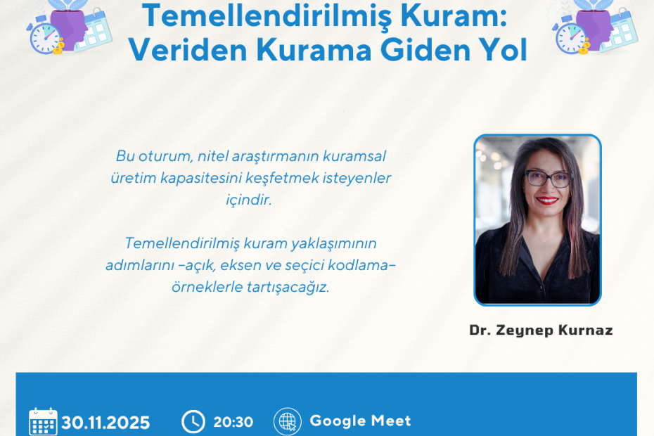 Bu oturum, nitel araştırmanın kuramsal üretim kapasitesini keşfetmek isteyenler içindir. Temellendirilmiş kuram yaklaşımının adımlarını –açık, eksen ve seçici kodlama– örneklerle tartışacağız. Katılımcılar, veriden yola çıkarak kuram geliştirme sürecinin mantığını kavrayacak… Daha fazlasını oku »Temellendirilmiş Kuram: Veriden Kurama Giden Yol