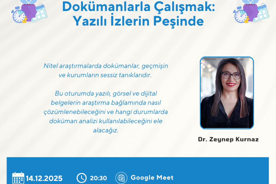 Nitel araştırmalarda dokümanlar, geçmişin ve kurumların sessiz tanıklarıdır. Bu oturumda yazılı, görsel ve dijital belgelerin araştırma bağlamında nasıl çözümlenebileceğini ve hangi durumlarda doküman analizi kullanılabileceğini ele alacağız. Katılımcılar, belgelerin ardında… Daha fazlasını oku »Dokümanlarla Çalışmak: Yazılı İzlerin Peşinde