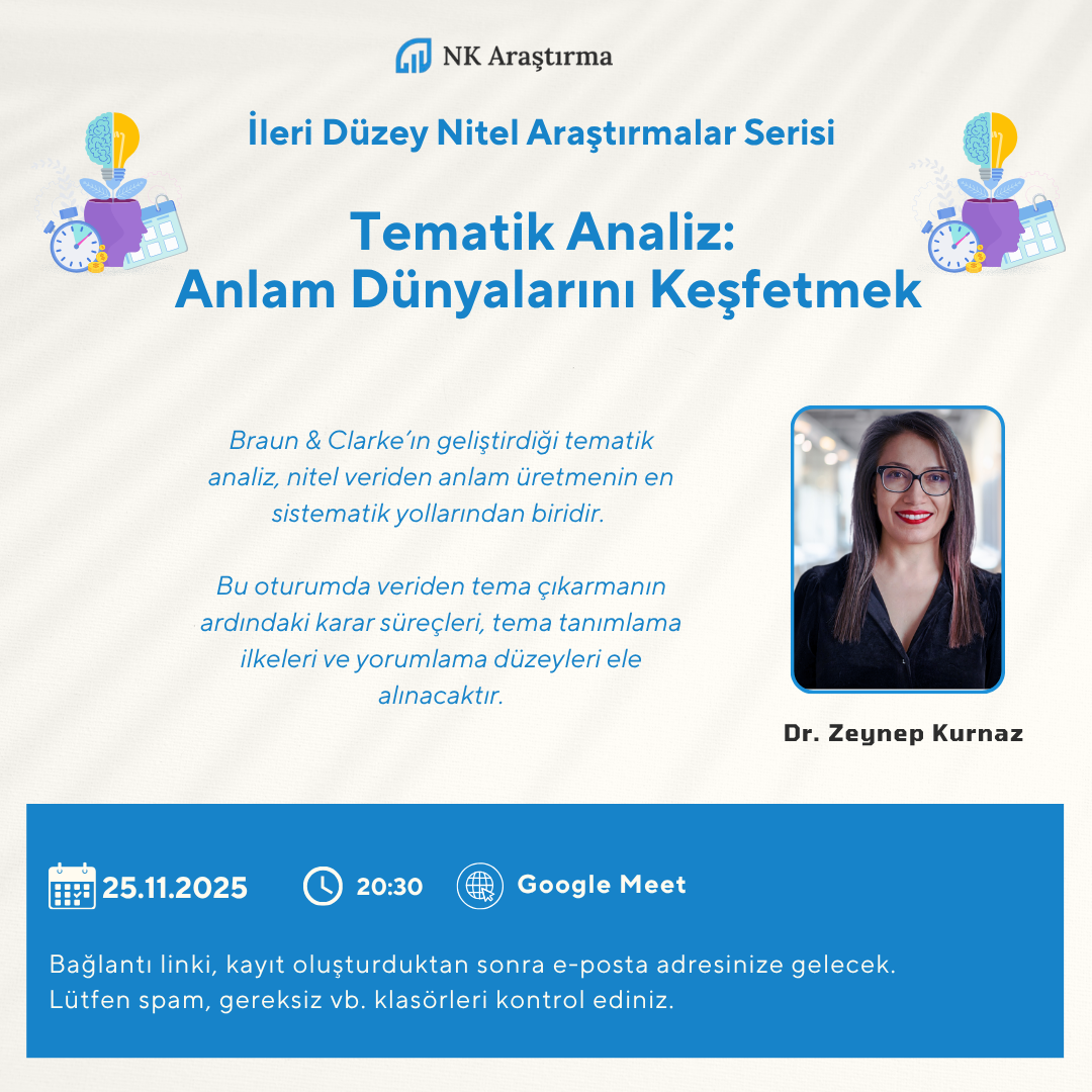 Braun & Clarke’ın geliştirdiği tematik analiz, nitel veriden anlam üretmenin en sistematik yollarından biridir. Bu oturumda veriden tema çıkarmanın ardındaki karar süreçleri, tema tanımlama ilkeleri ve yorumlama düzeyleri ele alınacaktır. Katılımcılar, altı aşamalı tematik analiz sürecini –veriye aşinalıktan temaların raporlanmasına kadar– örneklerle takip edeceklerdir. Temaların yalnızca “tekrar eden kalıplar” değil, bir anlam dünyasının yapıtaşları olduğu… Daha fazlasını oku »Tematik Analiz: Anlam Dünyalarını Keşfetmek