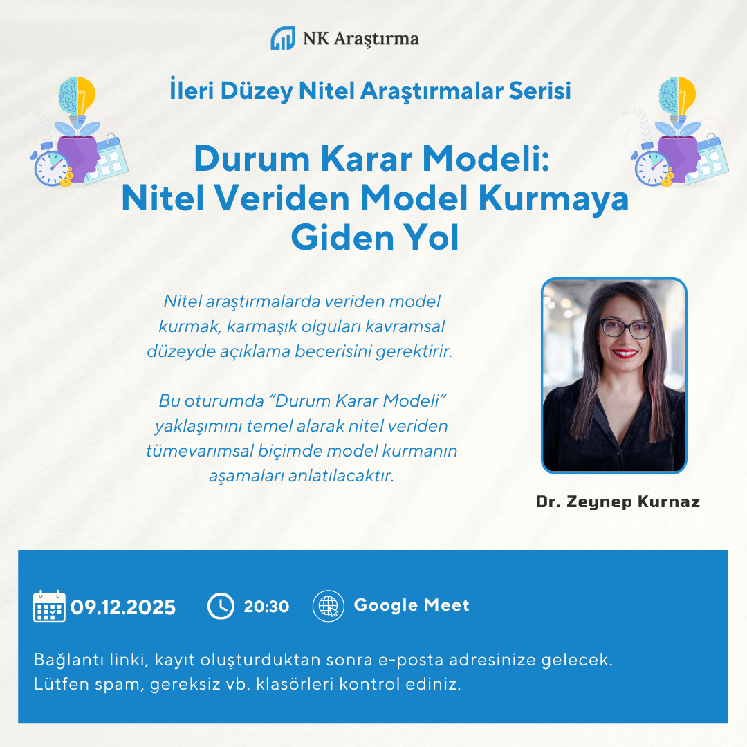 Nitel araştırmalarda veriden model kurmak, karmaşık olguları kavramsal düzeyde açıklama becerisini gerektirir. Bu oturumda “Durum Karar Modeli” yaklaşımını temel alarak nitel veriden tümevarımsal biçimde model kurmanın aşamaları anlatılacaktır. Katılımcılar, durum karar modelinin mantığını, temalar arası ilişkilerden hareketle bir karar ağacı ya da açıklayıcı yapı geliştirme sürecini öğreneceklerdir. Model kurmanın yalnızca bir son aşama değil, sürekli… Daha fazlasını oku »Durum Karar Modeli: Nitel Veriden Model Kurmaya Giden Yol